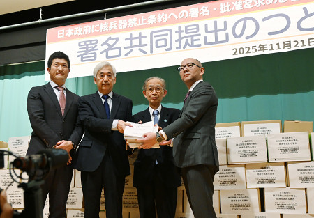 日本原水爆被害者団体協議会(日本被団協)などは21日、東京・永田町で集会を開き、核兵器禁止条約への署名、批准を求める署名344万9012筆を政府に提出した。写真は浜住治郎事務局長(右から2人目)ら。 【時事通信社】
