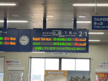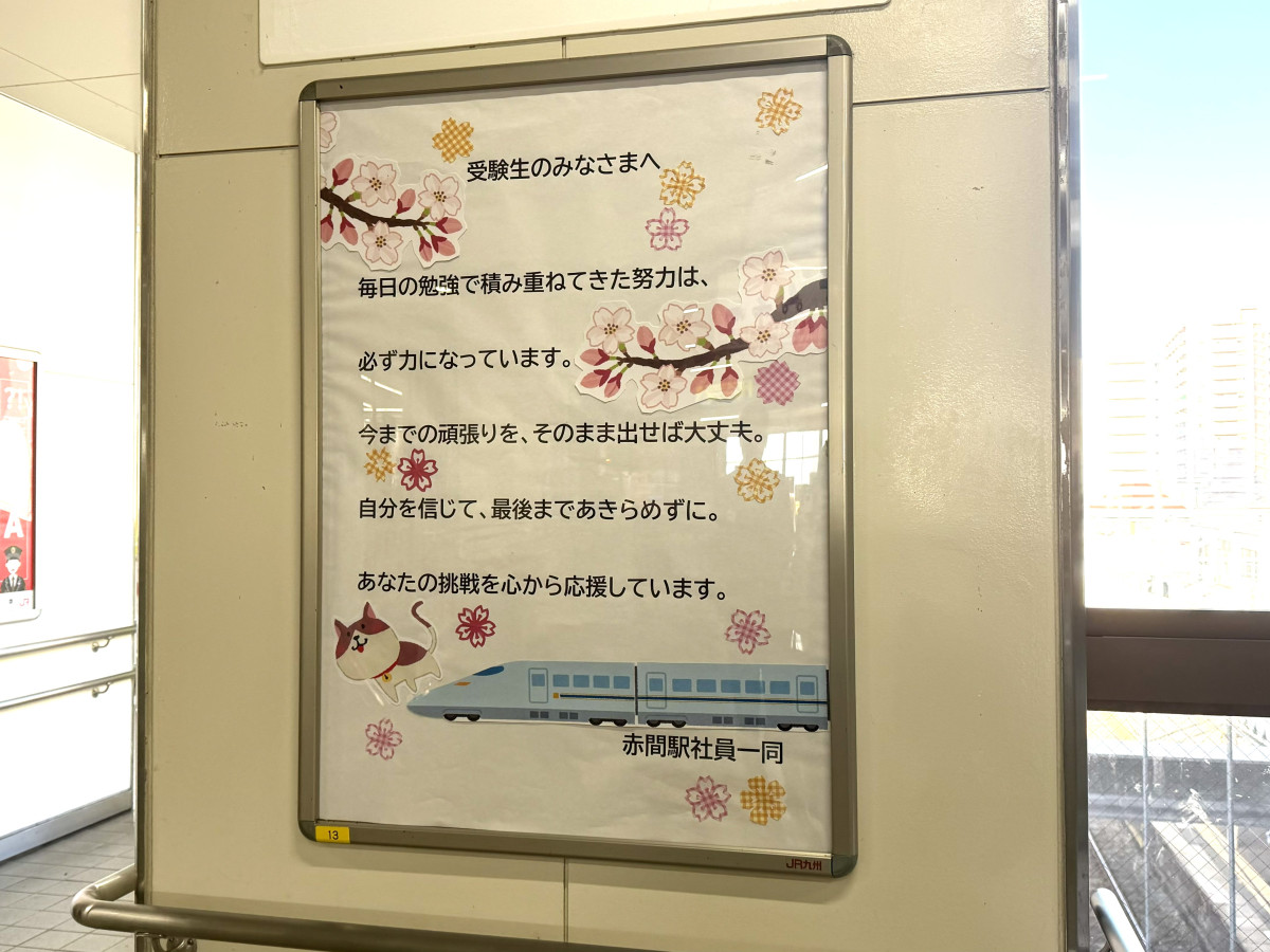 JR赤間駅・東郷駅が2月12日、電車の到着時刻や行き先を示す案内掲示装置「発車標」に学生応援メッセージを表示する取り組みを行った。