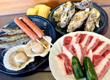 メニューは、カキ盛り(大=1,500円、中=1,200円、小=700円)をはじめ、牛バラ(1,200円)、エビ(300円)、ホタテ(400円)、トウモロコシ(300円)、ウインナー(200円)などのサイドメニュー、ミニ海鮮丼(1,000円)、ミニ穴子丼、「助六ずし」(600円)など和食店ならではのメニューも用意する。