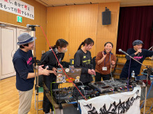 講堂には、イベントなどで使う実際の機材を持ち込みDJブースを設営。ターンテーブルを手で前後に動かし、キュルキュルという特徴的な効果音を生み出す「スクラッチ」を実演した。児童・生徒も実際に機材に触れて音を出すことに挑戦した。