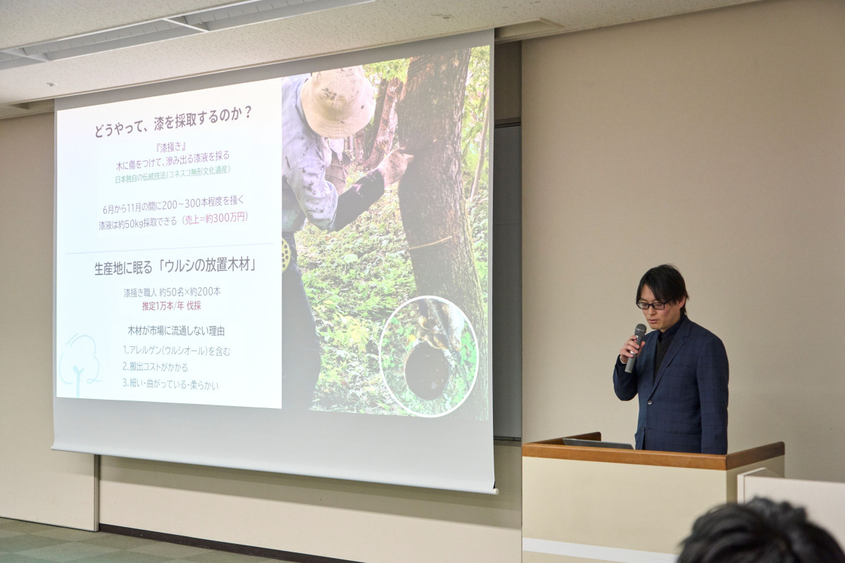 廃棄される『漆(うるし)』の木材を活用した天然染料の開発および製品化」のプランを発表した三木博文さん
