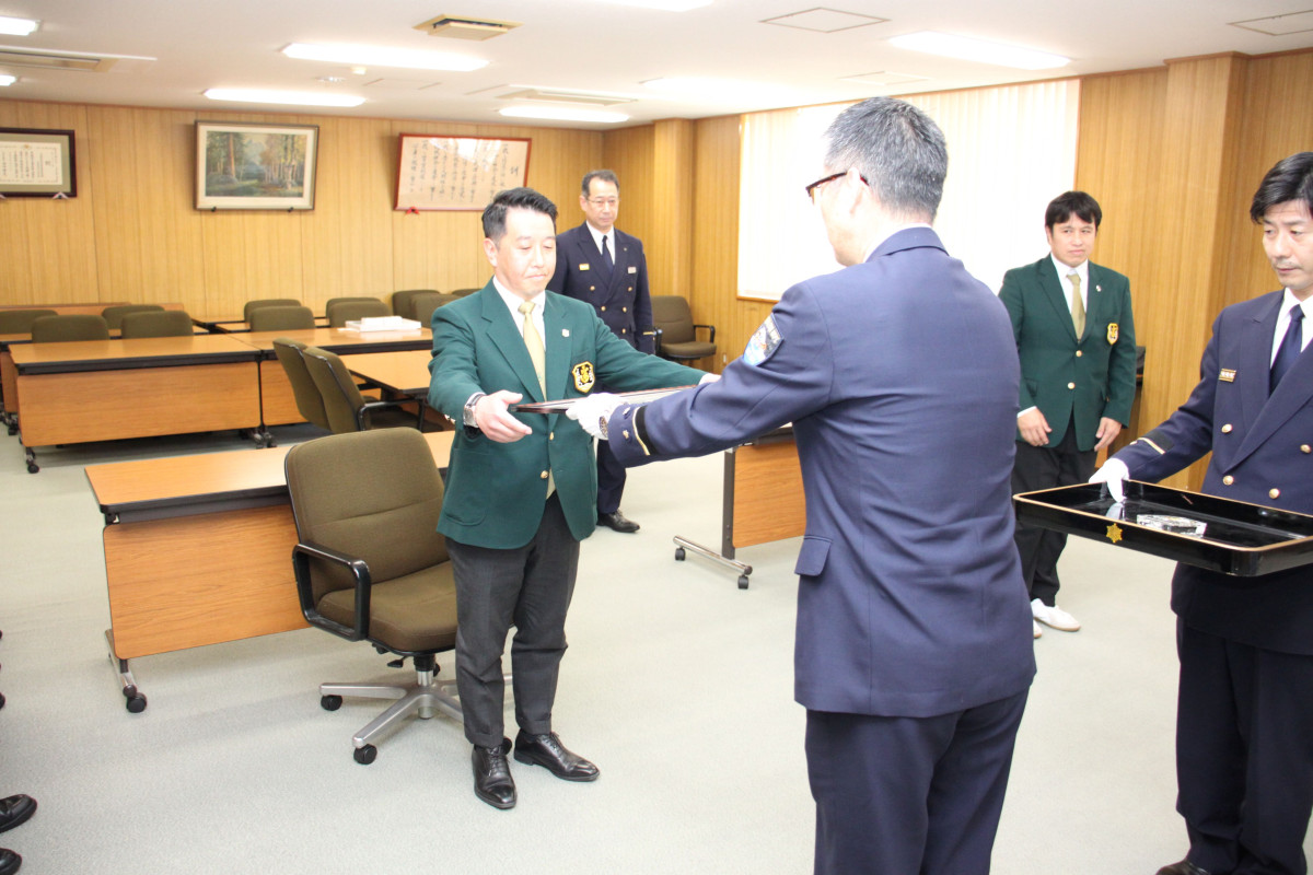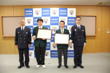 宗像地区消防本部で4月5日、ラグビーのプレー中に心肺停止となった男性を救護したとして、大曲徹さんと藤野大樹さんに感謝状が贈られた。