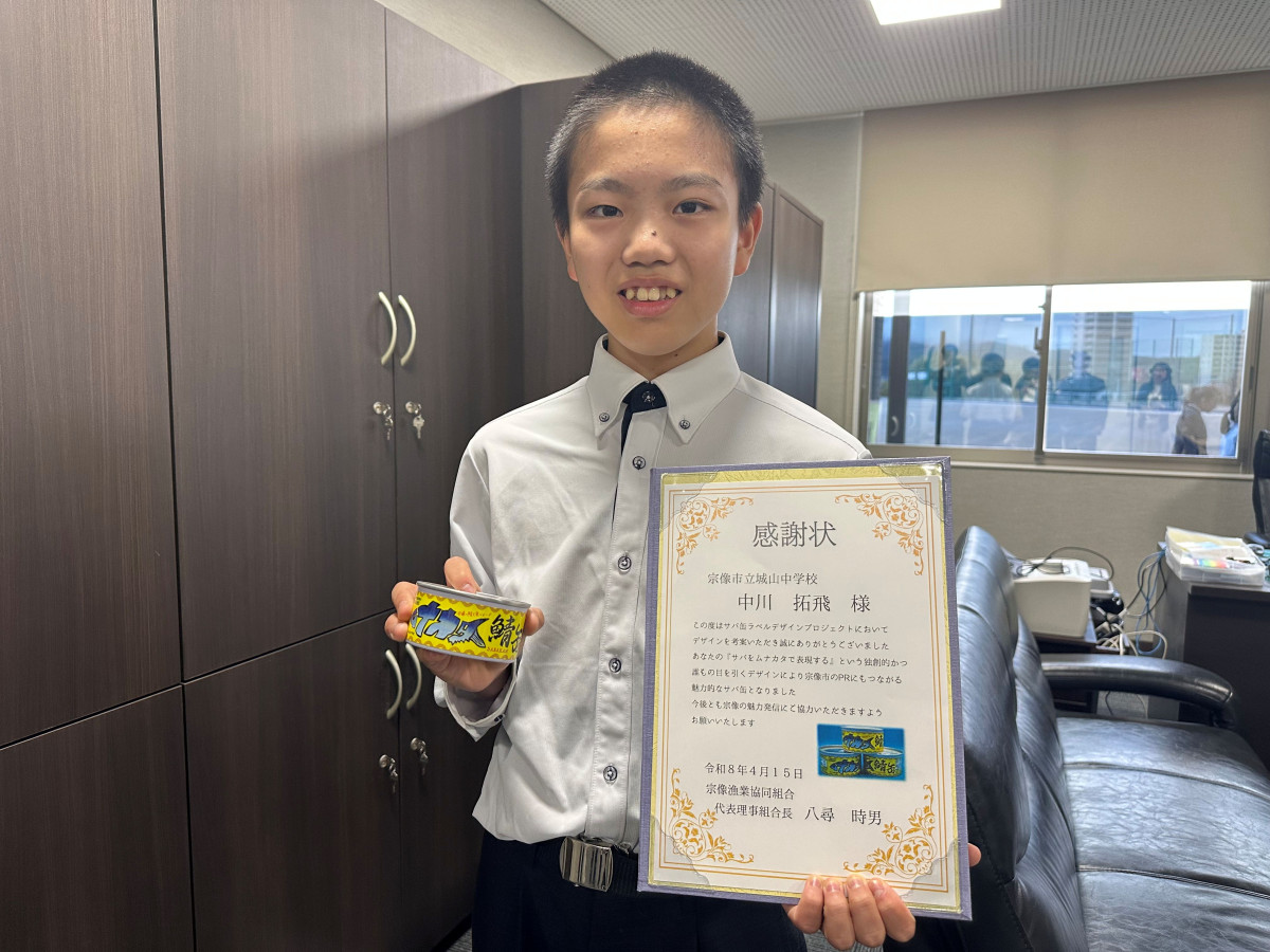 宗像漁業協同組合(宗像市鐘崎)が4月15日、地元で水揚げされたサバを使った缶詰商品のパッケージデザインを考案した城山中学校(陵厳寺1)9年生の中川さんに感謝状を贈った。