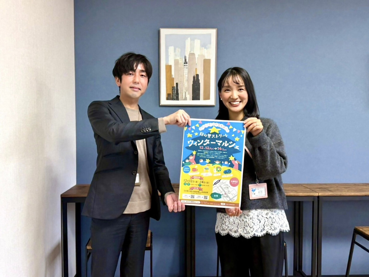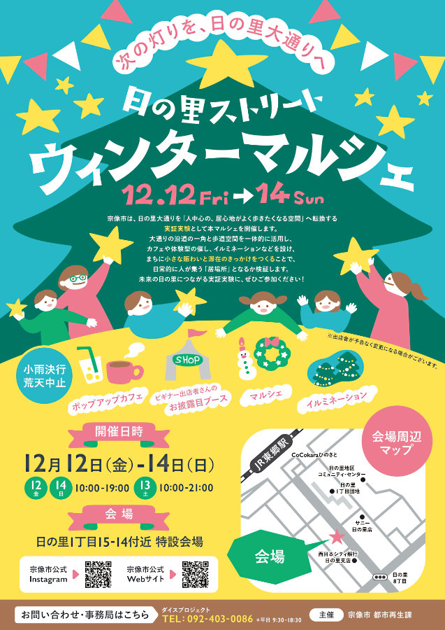 12月には、これまで日の里で脈々と受け継がれてきた灯りを広げていくための新しい一歩として、社会実験「日の里ストリートウィンターマルシェ」が開催されます。コンセプトは「次の灯りを、日の里大通りへ」。日の里大通り沿いの土地と歩道空間を一体的に使うことで、カフェや出店ブースを設け、通りをただ通りすぎるのではなく、それぞれの時間を過ごす「居場所」へと変えていくことができるかどうかを、実証実験するものです。市民ワークショップで挙がった「こんなことをしてみたい」「大通りがこんなふうに使えたらいい」という住民の意見をもとに「誰かがまちを変える」のではなく、「みんなで灯りをつなぐ」そんな思いが、この取り組みの中心にあります。企画の狙いを担当者の宗像市都市再生課・濱村さんと前村さんに聞きました。